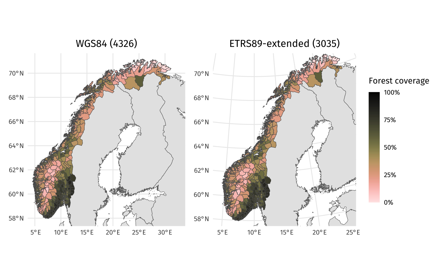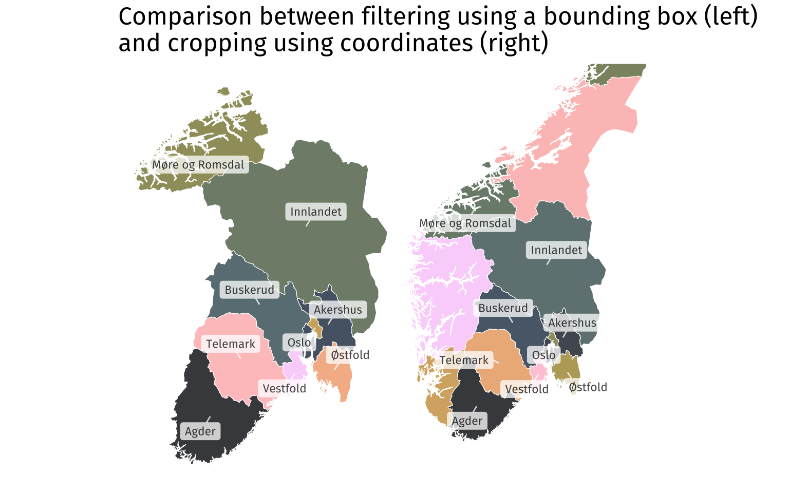 As you can see, this puts the labels directly in the middle of each spatial area (in this case fylke). Under the hood it calculates the centroid for each area and puts the label there. However, because Norway is quite oddly shaped and southern Norway has multiple smaller fylker, the labels overlap and obscure each other. The geom_sf_label() or geom_sf_text() functions work better if you have more uniformly distributed features. As an alternative, we can calculate the centroids manually and use the geom_label_repel() function from {ggrepel} to plot them instead. Calculating the centroids manually is easily done with {sf}’s st_centroid(), but in the dataset we used I got an error that some of the polygons overlap and one trick to address this is to transform the dataset from two different coordinate reference systems (CRS) using the st_transform() function