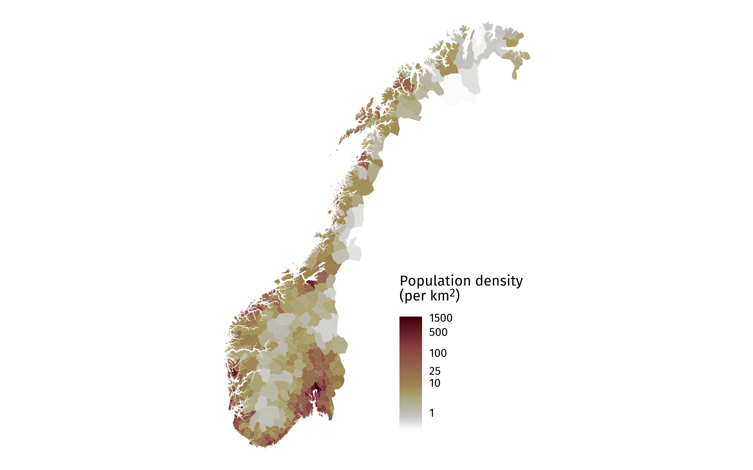 Now the labels are all readable. Oslo is a tiny fylke, so the label almost entirely covers the area on the map, but if we wanted we could finetune the label positioning some more. But aesthetics is not the main goal for today.