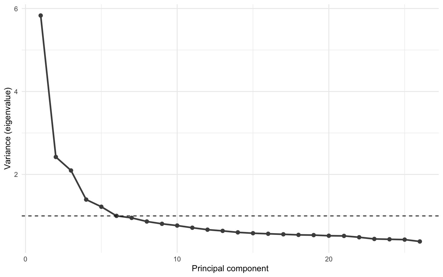 We can visualize the variance captured in each component by creating a scree plot. This plot shows the components on the x-axis and the variance on the y-axis. Scree plots also typically include a horizontal line to indicate the eigenvalue of 1. Scree plots are typically interpreted based on the “elbow” in the plot, where the variance decreases. This can be a bit subjective. That’s where the horizontal line comes in.