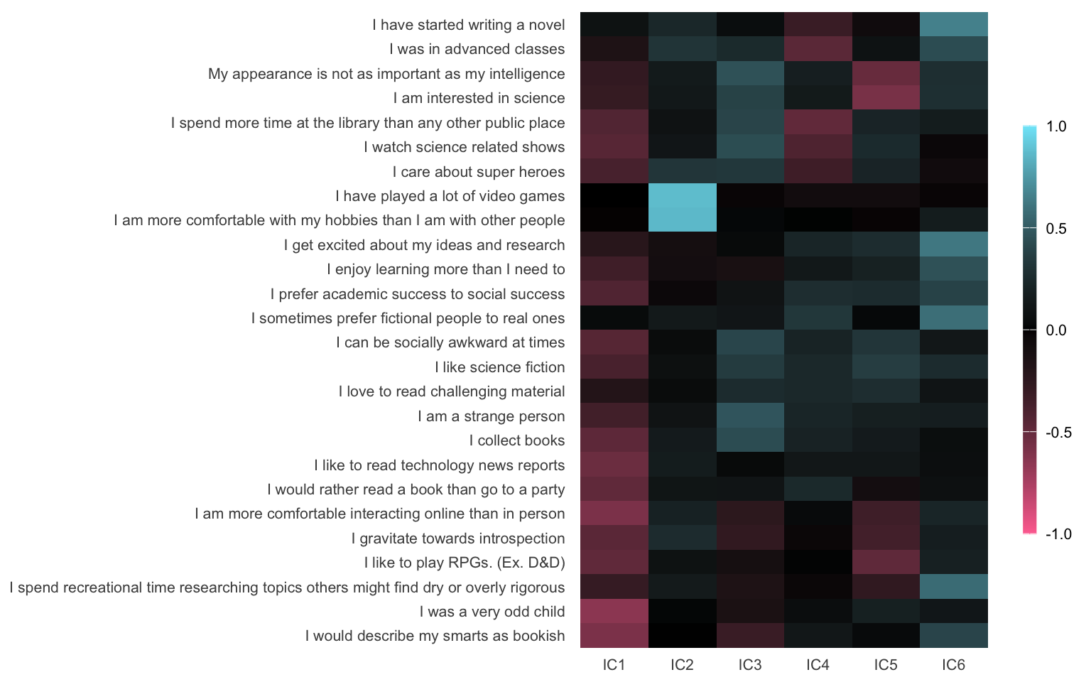 While the questions measure a more specific construct, the independent components instead capture a more general concept. So if we look at for instance IC2, we find that it captures mainly 2 questions about video games and hobbies. IC1 instead doesn’t capture questions on video games, but instead captures more variance related to “book smart-ness”. Other ICs capture more topics related to academic proficiency or extra-/introversion. The interpretation of the independent components is a very subjective task that is prone to interpretation bias. So look at the data, and make your own interpretation, but also give the data to others and see what they read in this figure.