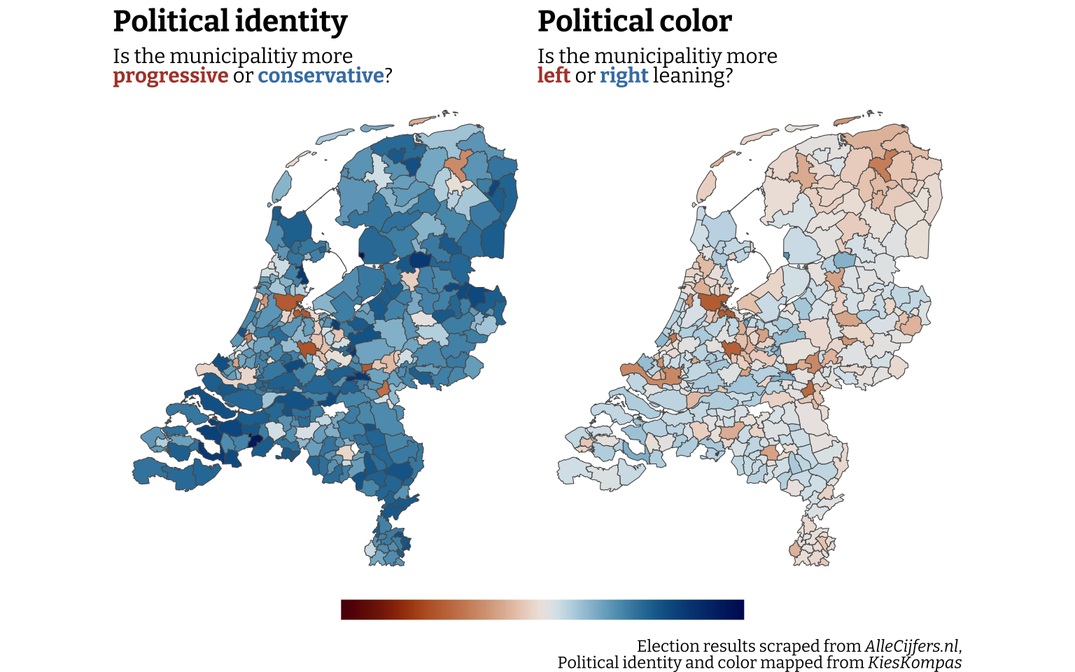 The thing I was most interested in at first is how progressive or conservative (I’ll refer to this as “political identity” from now on), and how left- and right-wing the municipalities are (“political color”). As noted before, the political color of the PVV is somewhat controversial, where KiesKompas would put in the centre-right due to it’s populist agenda, the party is usually mentioned among the far-right parties, both nationally and internationally. I could change the value for this part of the analyses, but I’m not comfortable setting another value, so look at the following plots with this caveat in mind. Considering the electoral victory the PVV won this election cycle, the plots should probabaly look more right-wing than the shown values represent.