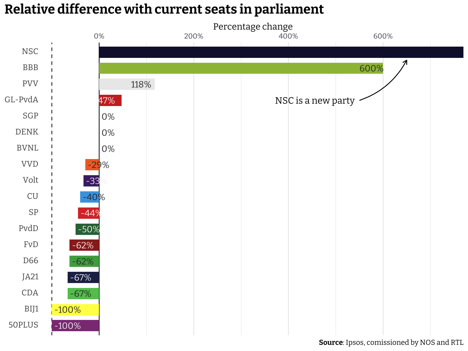 Since the NSC is a new party it’s increase (no matter how little or large it would have been) is infinite. Since the party got 20 seats, I think it looks fairly logical to have it appear at the top. If it was a much smaller party, I would have maybe forced it to be shown at the bottom to incidate that this is a statistical anomaly. The Boer Burger Beweging (BBB) has one seat in the current parliament after their first participation in the previous election, but will increase to 7 in the next parliament that will be seated early December. There are two parties that according to these numbers will be removed from parliament (indicated by the 100% decrease in seats in parliament). I would say that having the most important numbers be somewhat squished on the left of the plot is perhaps not ideal, but it’s a trade-off from showing the large increase in the NSC and BBB.